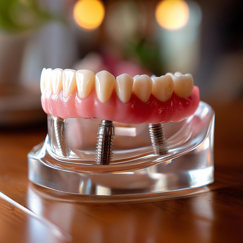 Implant-supported dentures combine the comprehensive coverage of a full denture with the stability and confidence of dental implants. A specially designed prosthesis snaps securely onto strategically placed implant posts, keeping it firmly in place throughout the day, no adhesives required, no shifting while you talk or eat.